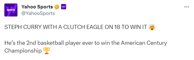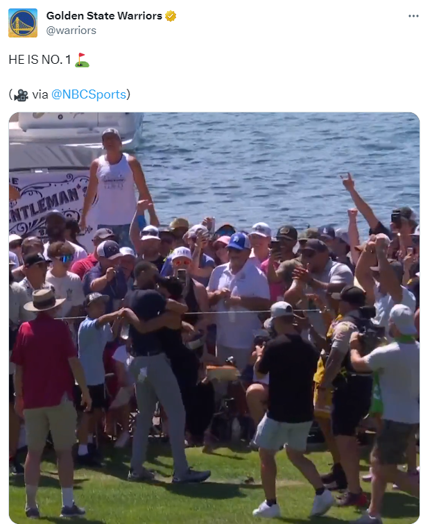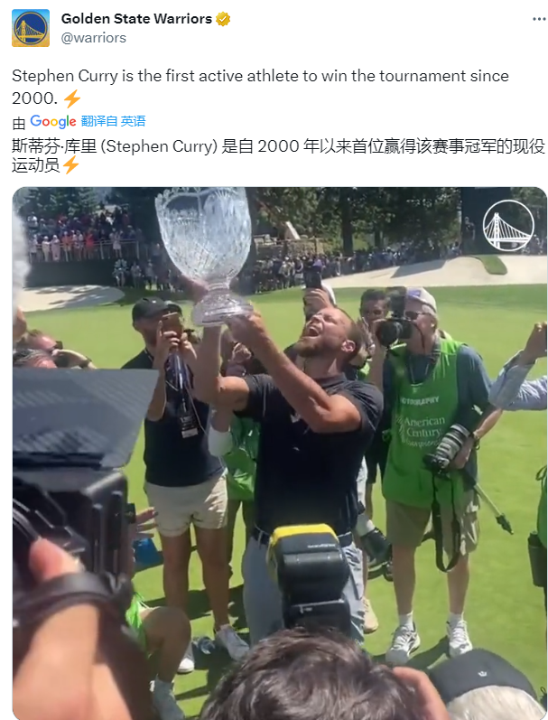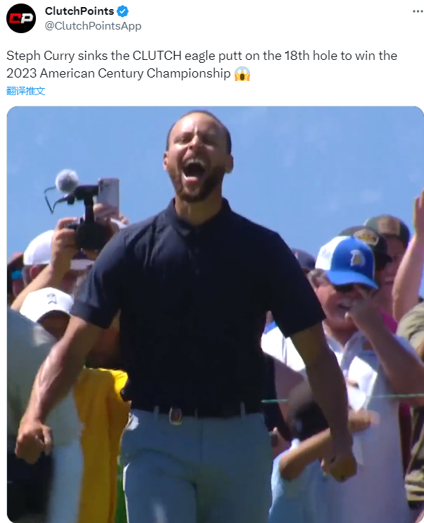 在美國高爾夫世紀錦標賽上,隨著庫裡推桿進洞完成老鷹球,他正式奪得該賽事2023年的冠軍,也是第34屆該賽事的冠軍;庫里奪冠后把帽子扔向天空,一路奔襲、雙手握拳怒吼慶祝,擁抱愛妻阿耶莎,後者順勢抬起雙腳,直接趴在庫裡的懷中;現場觀眾也為庫裡歡呼。