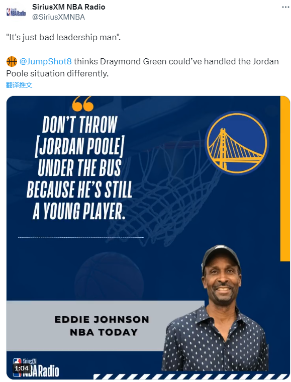 格林拳擊普爾事件再引熱議,前NBA最佳第六人埃迪-約翰遜在節目中談及此事,表示:格林應該為自己的行為承擔責任,普爾對於格林來說還是個小老弟,所以追夢的職責就是要讓他變得成熟,但是追夢不知道如何幫助他成熟。不要因為普爾還是一名年輕球員就將他放在媒體的曝光下,這只能說明追夢的領導力很糟。