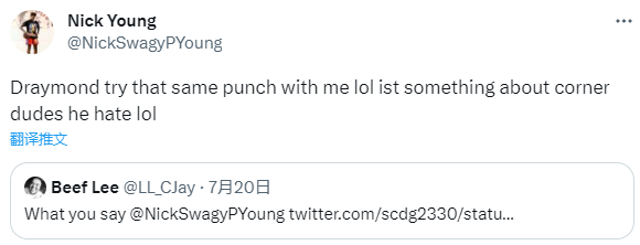 網友曬出尼克斯和追夢的視頻並寫道:這你怎麼說?@尼克-楊;尼克-楊回复:追夢也給我來了同樣的一拳,哈哈,他最煩那些底角球員了,哈哈。