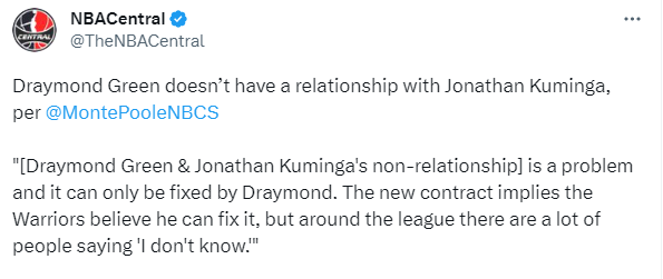 現在勇士更衣室又有了新的隱患,名記Monte Poole報導,德拉蒙德-格林和庫明加之間無關係是球隊的一個問題,只有德拉蒙德才能解決,新合同意味著勇士隊相信他能解決這個問題,但全聯盟很多人說’我不知道’。