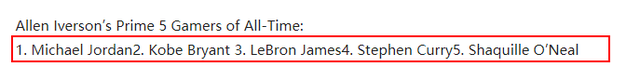 艾弗森的具體名單是1.邁克爾·喬丹、2.科比·布萊恩特、3.勒布朗·詹姆斯、4.史蒂芬·庫裡、5.沙奎爾·奧尼爾!