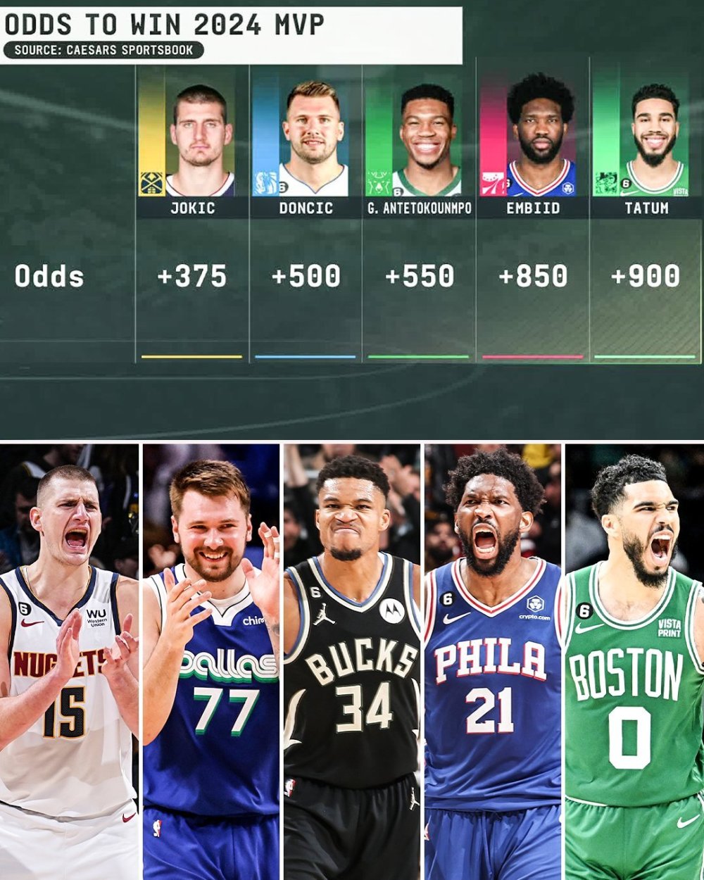 約基奇領跑2024年常規賽MVP賠率榜,東契奇、字母哥位列2、3,恩比德第4,塔圖姆第5。