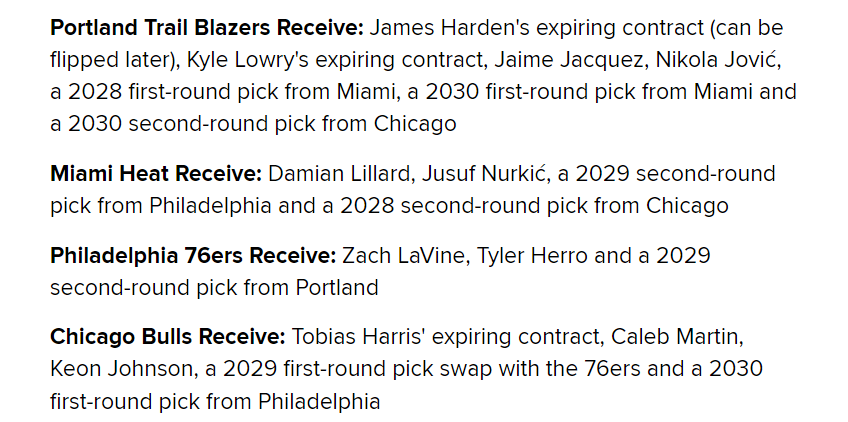 開拓者得到:哈登的到期合同(可後續再交易)、洛瑞的到期合同、小海梅-哈克斯、約維奇、熱火的2028年首輪和2030年首輪、公牛的2030年首輪;