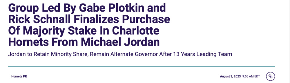黃蜂官方聲明,球隊的所有權交易已經完成,加布-普洛特金和里克-施納爾領導集團成為新的大老闆,喬丹保留少數股權,並將擔任候補管理者。