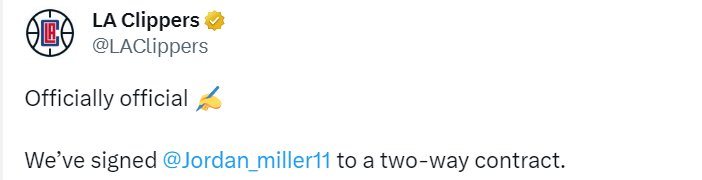 快船官方宣布,他們已經和喬丹-米勒簽下一份雙向合同。他是2023年選秀大會次輪第48號秀,這筆簽約完成後,快船的陣容名單是16+2,16名球員擁有常規合同,2名球員擁有雙向合同,預計會有進一步的調整。小卡和喬治將率隊沖擊總冠軍。