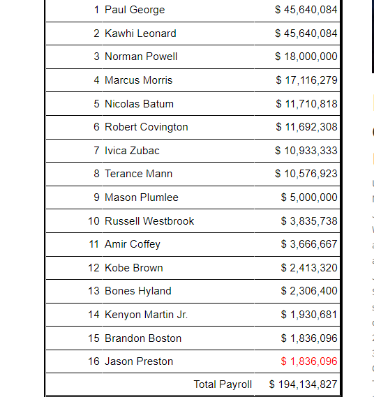 按照薪金高低,常規陣容的16人包括喬治、萊昂納德、鮑威爾、莫里斯、巴圖姆、科溫頓、曼恩、普拉姆利、威少、科菲、科比-布朗、海蘭德、小馬丁、波士頓、普雷斯頓。其中普雷斯頓的183萬美元是非保障合同。雙向合同是迪亞巴特和喬丹-米勒。快船這套陣容的總薪水是1.94億美元,加上奢侈稅超過3.03億美元。