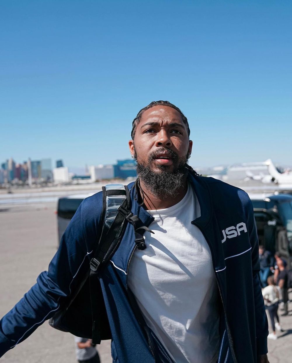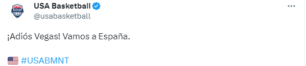 今日美國男籃全隊正式飛往西班牙,美國隊官推寫道:再見了拉斯維加斯,我們去西班牙了。