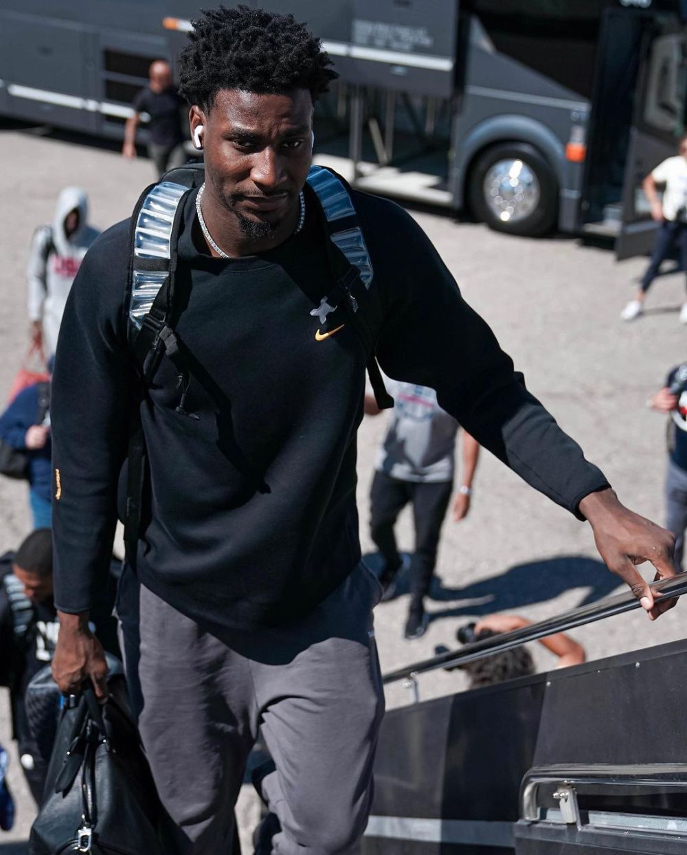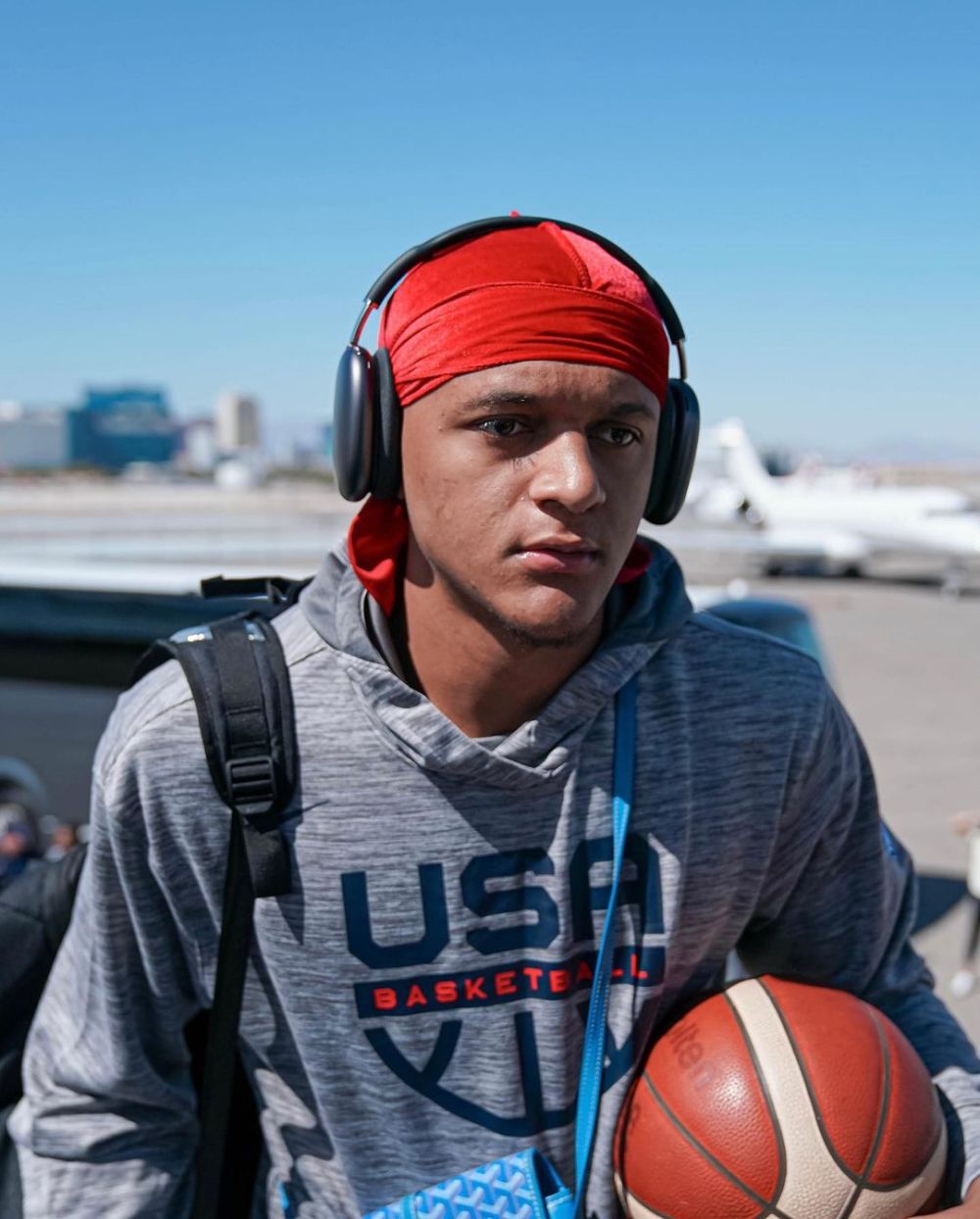 美國男籃眾將英格拉姆、布里奇斯、里夫斯、小傑克遜等人都背著雙肩包登上飛機,班凱羅抱球籃球,紅色頭巾十分搶鏡。