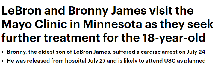8月9日,美媒TMZ拍到了詹姆斯帶著大兒子佈朗尼現身妙佑醫療(此前譯名“梅奧診所”)附近地區的畫面。此前有人拍到詹姆斯獨自出現的鏡頭,如今他和布朗尼一起現身,基本確定了此行是為兒子的心臟驟停問題尋求醫療意見。