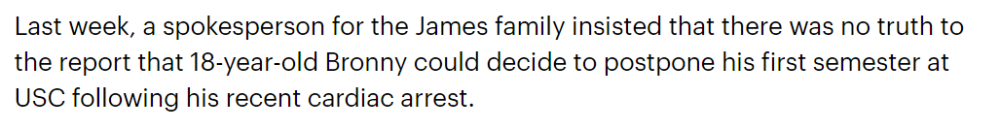 詹姆斯家族的發言人告訴《每日郵報》,“任何有關布朗尼正在考慮推遲大學第一學期開學的報導都是不真實的”。此前有傳聞詹姆斯考慮讓布朗尼休學,現在看來,他們還是準備正常上學。