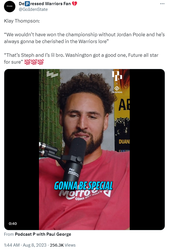 勇士永遠會記住他,他幫助球隊重新贏得冠軍,自己知道他會在奇才打得很好,但看著他身穿奇才球衣還是有點奇怪,他是自己和庫裡的小兄弟。