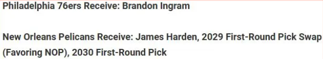 這不?根據美國著名媒體《後仰的世界》報導,76人可以和鵜鶘隊進行一筆“3換1”的史詩級交易,具體的交易內容為:76人以哈登、一個首輪選秀權、一個首輪互換權為籌碼,交易得到鵜鶘隊的英格拉姆;一旦這筆交易能夠成為現實,那麼必然會讓兩支球隊實現共贏的局面,具體如何影響兩支球隊呢?讓我們繼續往下看看。