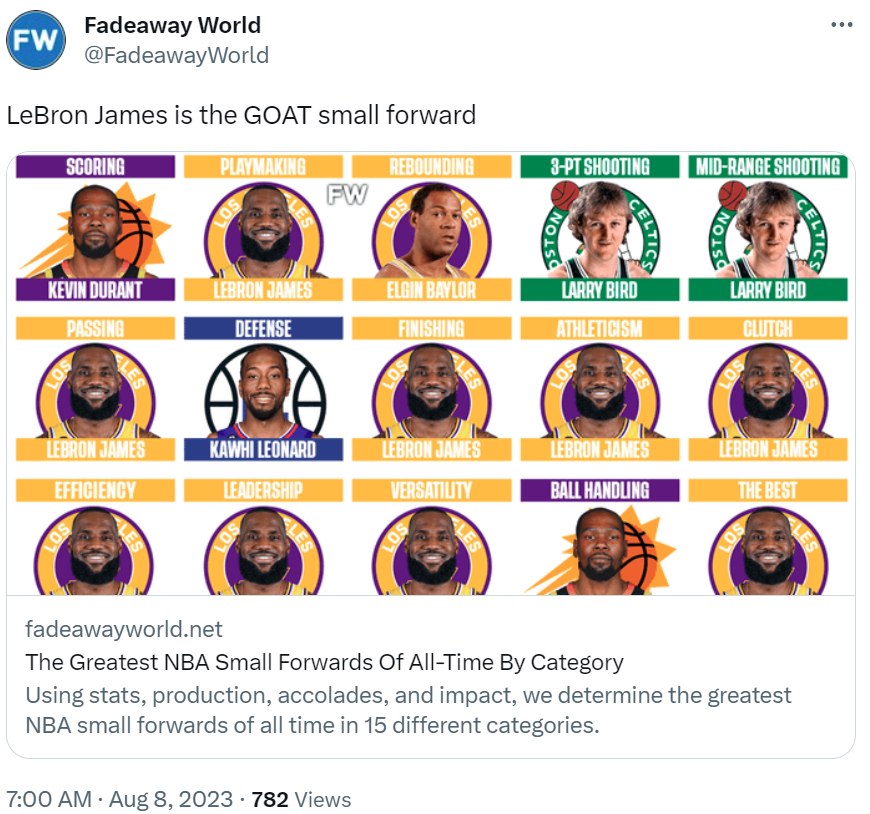 美媒《fadeawayworld》按照能力評選歷史最強小前名單,其中現役三人入選,杜蘭特2項第一,老詹一人獨占9項。