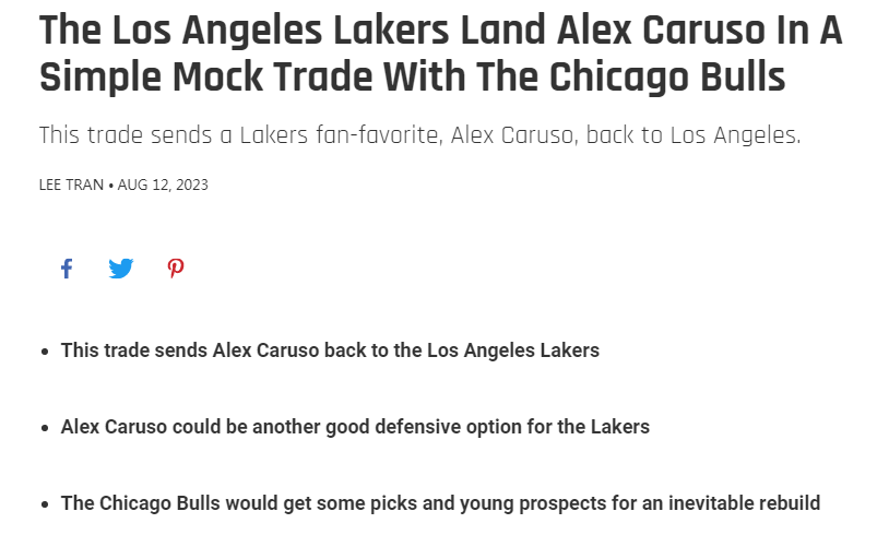 近日,美國媒體FW建議洛杉磯湖人隊從芝加哥公牛隊手中換回防守悍將亞歷克斯-卡魯索。文中寫道在2021年夏湖人給小塔克三年3100萬的合同放棄卡魯索明顯是錯誤的決定,如今小塔克已經被交易到爵士,而卡魯索在公牛甚至坐穩先發席位。