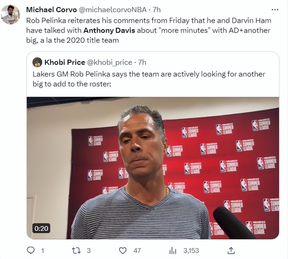 此前佩林卡已經在採訪中提過:戴維斯的腳傷恢復情況良好,我與哈姆已經跟戴維斯討論過他+另一個大個子一同先發的陣容,復刻2020年奪冠的陣容,下賽季雙塔會打更多時間。(打雙塔很明顯是為了提升防守,上賽季湖人之所以能在賽季中後段創造奇蹟就是提升了尺寸與防守)