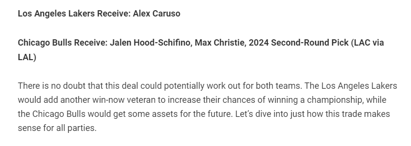 FW建議佩林卡用希菲諾、克里斯蒂、2024年次輪從公牛換回卡魯索,芝加哥公牛目前還在考慮重建與否,這筆交易對他們來說前可攻退可守,只要湖人願意犧牲首輪秀希菲諾+克里斯蒂得到卡魯索的難度不大。