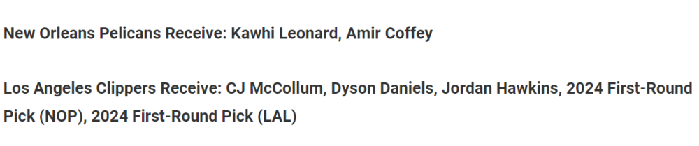 那快船未來應該怎麼辦?是繼續相信小卡和喬治,還是推倒重來(或者換個活法?)對此,專欄記者特朗李撰文,列出一組讓人意外的交易方案,具體如下:快船送走倫納德+科菲,從鵜鶘交易得到邁克勒姆+丹尼爾斯+霍金斯+24年首輪簽(來自鵜鶘)+24年首輪簽(來自湖人,在鵜鶘手中)。