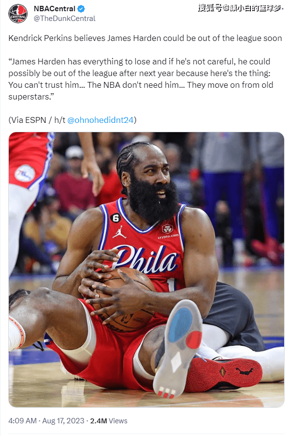 TNT評論員帕金斯在節目中談及哈登炮轟費城高管的事件:哈登的行為可能失去一切,如果他不小心的話,下賽季可能就不在NBA了。