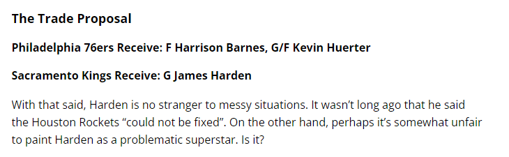 8月16日晚的交易模擬方案:國王送出哈里森-巴恩斯、凱文-赫爾特就可以得到哈登,連一個次輪簽都沒有!
