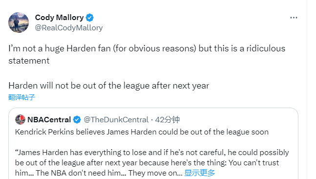 帕金斯的言論也很快引起爭議。籃網記者Cody Mallory寫道:“我不是哈登的超級粉絲(出於顯而易見的原因),但這(指帕金斯的言論)是一個荒謬的說法。哈登明年過後也不會離開這個聯盟。”