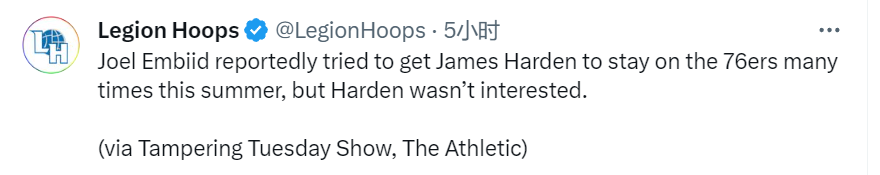 在哈登炮轟莫雷後,29歲的恩比德也在社媒上刪除了有關費城的簡介。如果哈登和恩比德都離開,76人或許就會被迫重建。美媒報導稱,恩比德今夏多次勸說哈登留在76人,但哈登不感興趣。