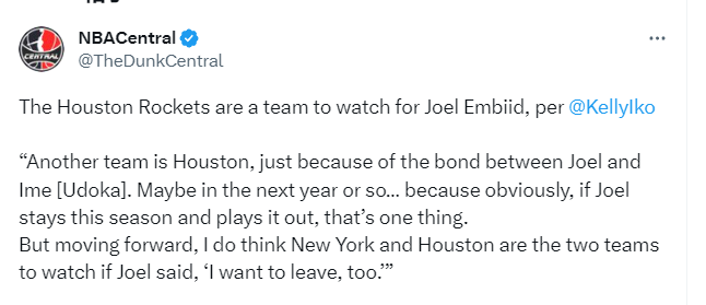 火箭記者Kelly Iko表示:“(除了尼克斯)另一支值得關注的球隊是火箭,因為恩比德和烏度卡之間的關係很好(注:兩人曾在費城共事)。也許恩比德會在下一年離隊,當然,如果恩比德新賽季留隊並打出好的表現,那就是另外一碼事。不過,展望未來,若恩比德想要離開,我認為尼克斯和火箭都是值得關注的球隊。”