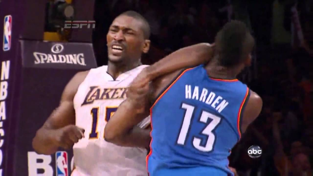 生涯末期為湖人效力,阿泰又將哈登肘出腦震盪,是有名的惹事型球員。