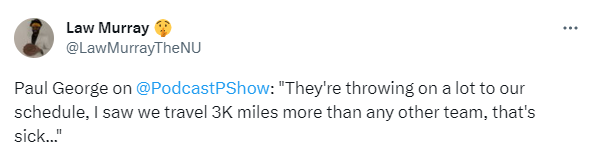 對於這樣的賽程,喬治公開吐槽道:他們給我們的賽程中增添了許多負荷,我看著我們要比別的隊伍飛至少多3000英里,這太噁心了…