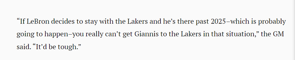 這位總經理還表示:“如果詹姆斯決定留在湖人,並在2025年後繼續留在那裡——這可能會發生,在這種情況下,你真的無法讓揚尼斯(字母哥)加盟湖人,這會非常難。”