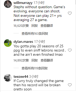 一位球迷寫道:“毫無疑問是庫裡(的紀錄更可能被打破),比賽一直在進化,每個人都能投籃,但不是每個人都能打超過21個賽季,還能生涯場均27分。”