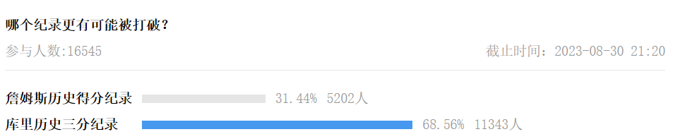 國內媒體平台也進行了這項投票,究竟庫裡還是詹姆斯的紀錄更可能被打破。目前投票顯示,超過68%的球迷認為是庫裡紀錄更容易被打破,而31%左右的球迷選擇詹姆斯。無論如何,兩項紀錄都是偉大球員創造的,等待著被挑戰。大家認為未來真的有人可以打破老詹的得分紀錄嗎?