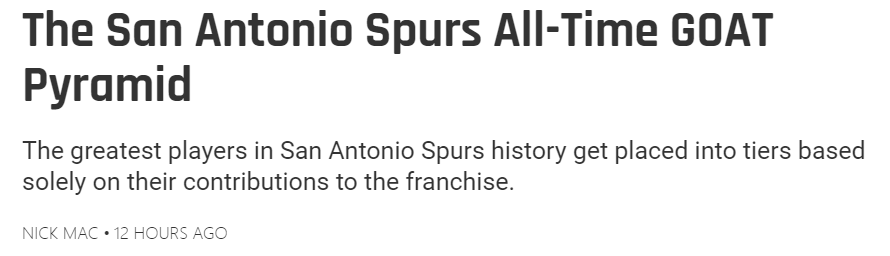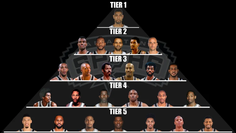 美媒《fadeawayworld》評選出了馬刺隊史GOAT金字塔,作為聯盟歷史上最成功的小球市球隊,馬刺擁有自己獨特的球隊文化,教練組帶來的影響力,目前還在輻射整個聯盟,潛移默化改變著籃球這項運動,而馬刺隊的成功,除了波波維奇偉大的執教能力之外,同樣離不開一眾頂級球員的加持。
