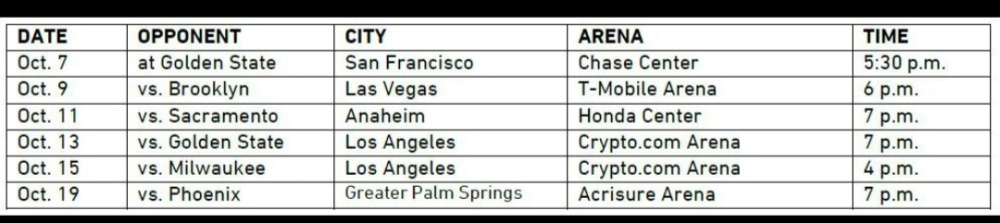 今日洛杉磯湖人官方宣布了下賽季季前賽賽程,將在10月7日-19日連打六場比賽,具體賽程如下(均為當地時間):