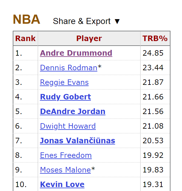 更瘋狂的大概是這個數字,德拉蒙德的生涯籃板率高達24.85%,這個數字排在歷史第一,超過了羅德曼(23.44%)、雷吉埃文斯(21.87%)、戈貝爾(21.66%)和小喬丹(21.56%)等人。