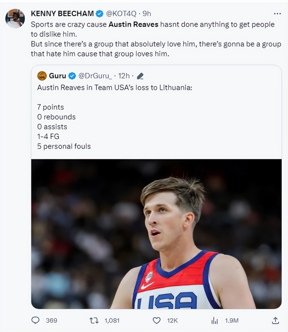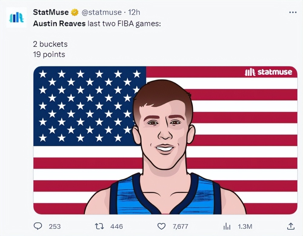 數據媒體STatMuse上傳里夫斯過去兩場比賽,運動戰2球卻拿了19分,6中2+罰球16中14,里夫斯只懂碰瓷。(對陣黑山一戰最離譜,1個運動戰卻得到12分,完全就是哈登二代)