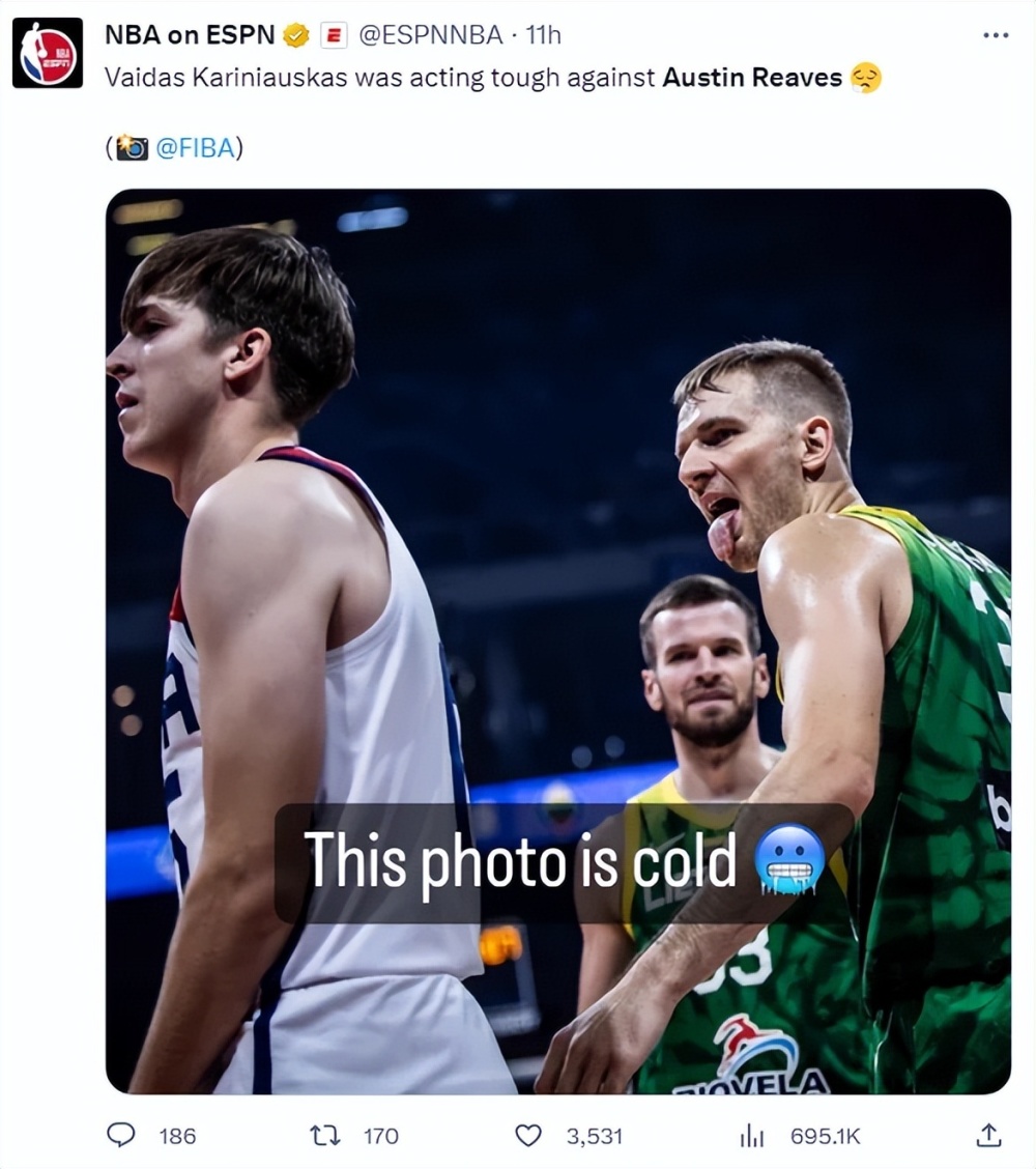 這場比賽里夫斯還有一個名場面,他被卡里尼奧斯卡斯強吃完成2+1後,卡利尼奧斯卡斯朝著里夫斯吐舌,NBA官方轉發FIBA曬圖:這張照片是世界杯最寒冷的時刻。(要知道卡利尼奧斯卡斯2米,里夫斯1.96米,但里夫斯就是防不住)