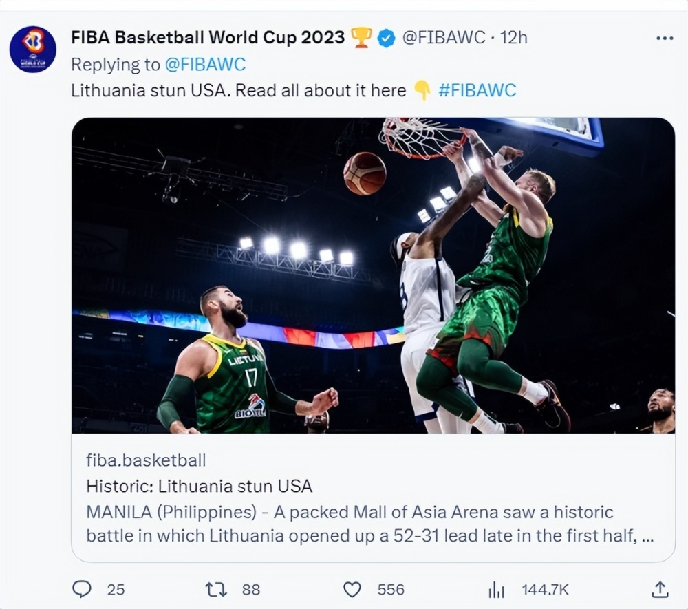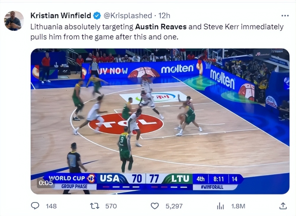 立陶宛男籃110-104擊敗美國男籃,美國男籃作為世界杯第一奪冠熱門卻倒在了立陶宛手下,這場比賽美國全隊遭到了痛批,主帥史蒂夫-科爾被噴“只懂庫裡的商人”。美國輸13個籃板+7個前場籃板,讓立陶宛以56%的三分命中率投進14個。