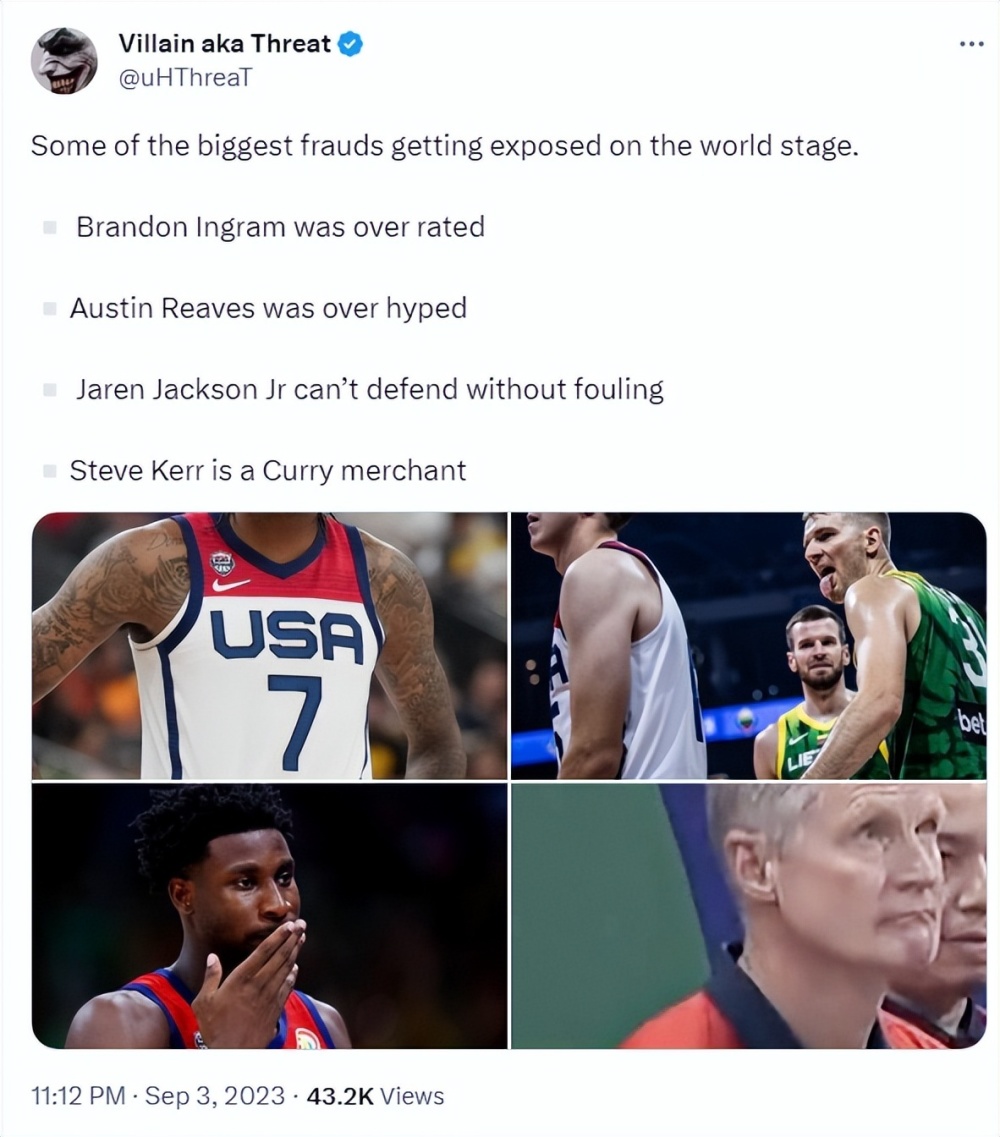 美國媒體Villain aka Threat炮轟這支美國隊,一些巨大的騙局在世界杯舞台被揭露:英格拉姆被嚴重高估,奧斯汀-里夫斯炒作過度,小賈倫不犯規就無法防守,科爾是一個只懂庫裡的商人。