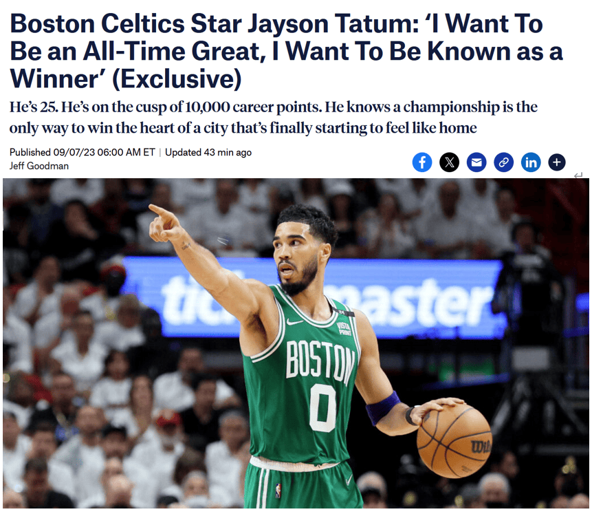 之後塔圖姆談到了個人和球隊的目標。他說道:“我想出現在凱爾特人隊史的總統山上面,伯德、拉塞爾、皮爾斯這些前輩為我們鋪平了道路,這些人的共同點是都有冠軍。我必須要奪冠才可能被納入考慮之中,我想要成為歷史級別的偉大球員,我想以一個贏家被人記住,我相信我會做到。”