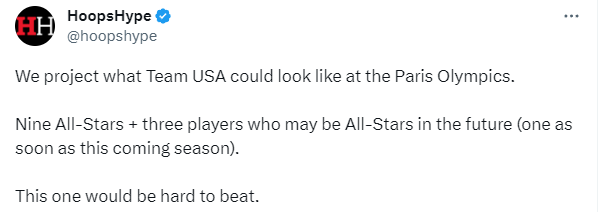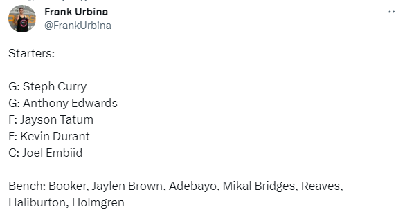 HoopsHype預測的這套陣容,首發是庫裡+愛德華茲+塔圖姆+杜蘭特+恩比德;替補陣容包括布克、杰倫-布朗、阿德巴約、布里奇斯、里夫斯、哈利伯頓和霍姆格倫。