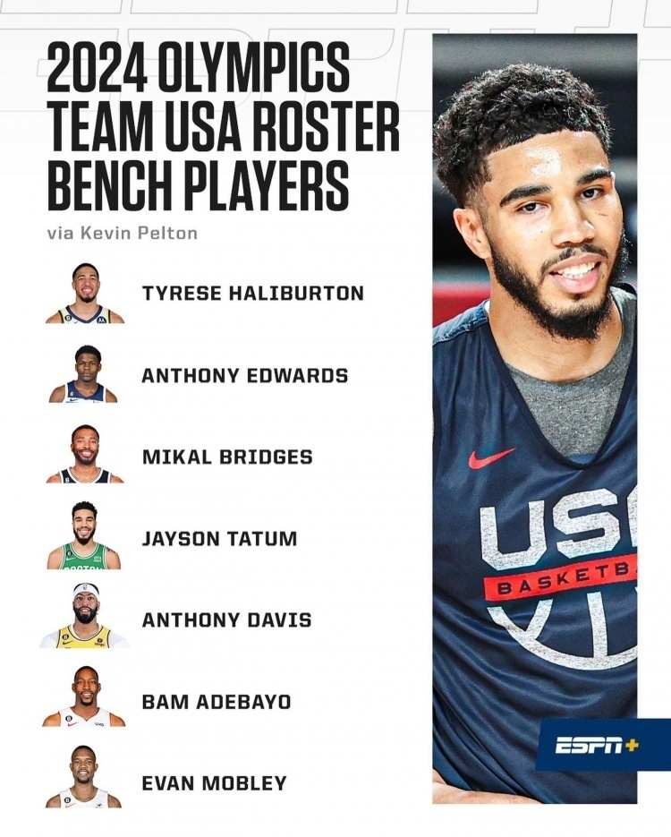 替補名單中除了戴維斯,另外6人分別是:哈利伯頓、愛德華茲、米卡爾-布里奇斯、塔圖姆、阿德巴約和小莫布里。可以看到,本屆名單中仍有3人留在隊中,分別是哈利伯頓、愛德華茲和布里奇斯,三人在這次表現還是不錯的,值得一個替補席位。此外,小莫布里入選也是有些意外,看來也是想要保護好內線,畢竟FIBA比賽並沒有防守3秒,內線還是很重要的。