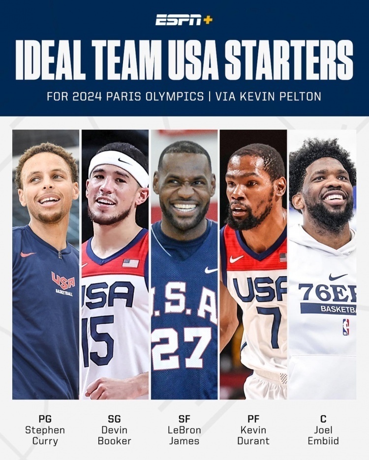 與其他媒體一樣,都是由詹姆斯、杜蘭特和庫裡領銜,這三人成為了不二人選,其中詹姆斯已經有所行動,有意再次回到國家隊,並將巴黎奧運會作為最後一舞。首發除了上面三人之外,還有布克和恩比德,這絕對是一套強大的陣容,每個球員在NBA都是場均30+的級別,且都擁有投射能力,到了國際舞台依然是強大的。