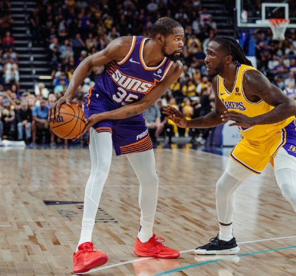 和詹姆斯的穩定輸出不同,杜蘭特此役開局階段完全夢遊,在布克和比爾高掛免戰牌的情況下,他成為了紫金軍團防守端重點照顧的對象,在嚴防死守下,杜蘭特也完全失準,前6次出手全部偏出,但是在他開啟死神降臨的模式後,成為了紫金軍團防守球員的夢魘,連中8球讓湖人隊束手無策,其中包括一記頂著詹姆斯的外線強投三分命中,此役杜蘭特雖然只出賽了17分鐘,但是依舊高效砍下了21分。