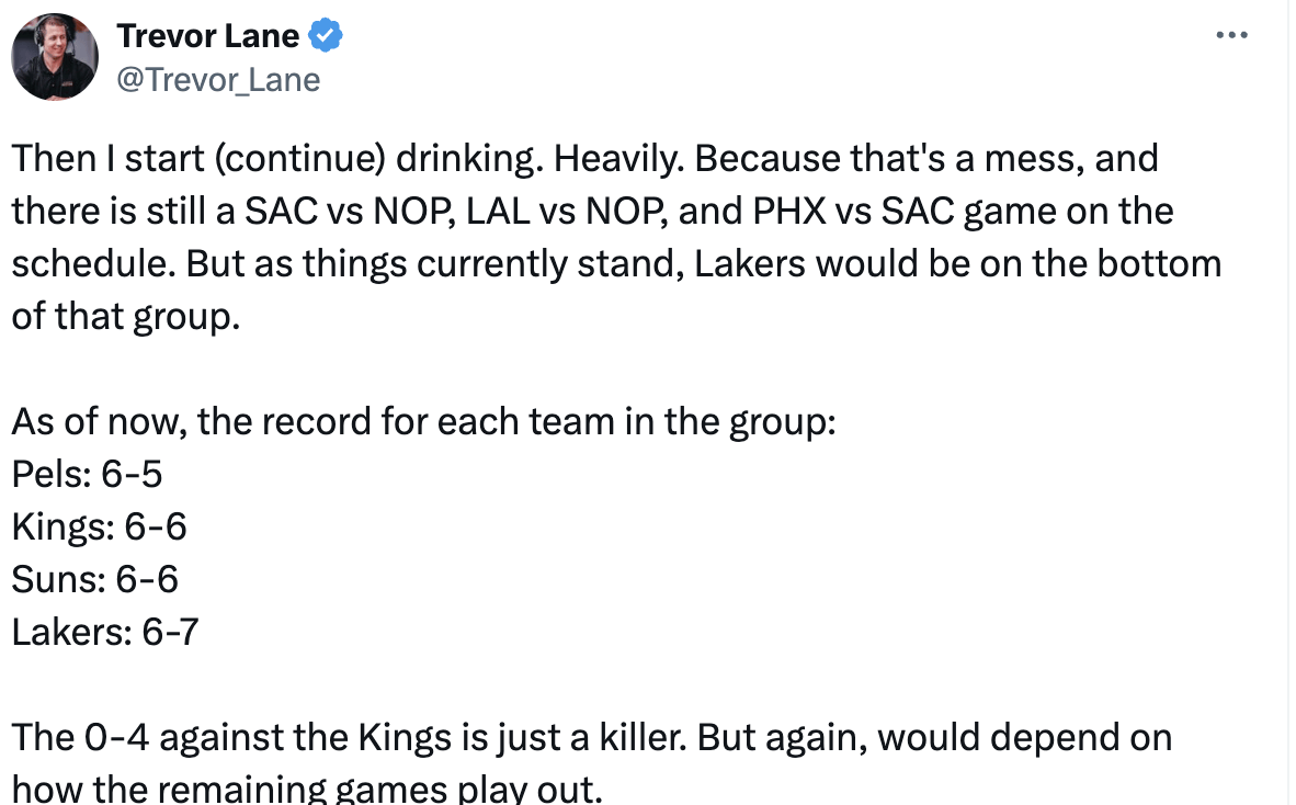 目前,鵜鶘、國王、太陽和湖人相互交手總戰績。鵜鶘是6勝5負,國王6勝6負,太陽6勝6負,湖人6勝7負,湖人最不利。因而,現在湖人的命運有一半掌握在別人的手上,盡力贏球的同時要等對手犯錯。