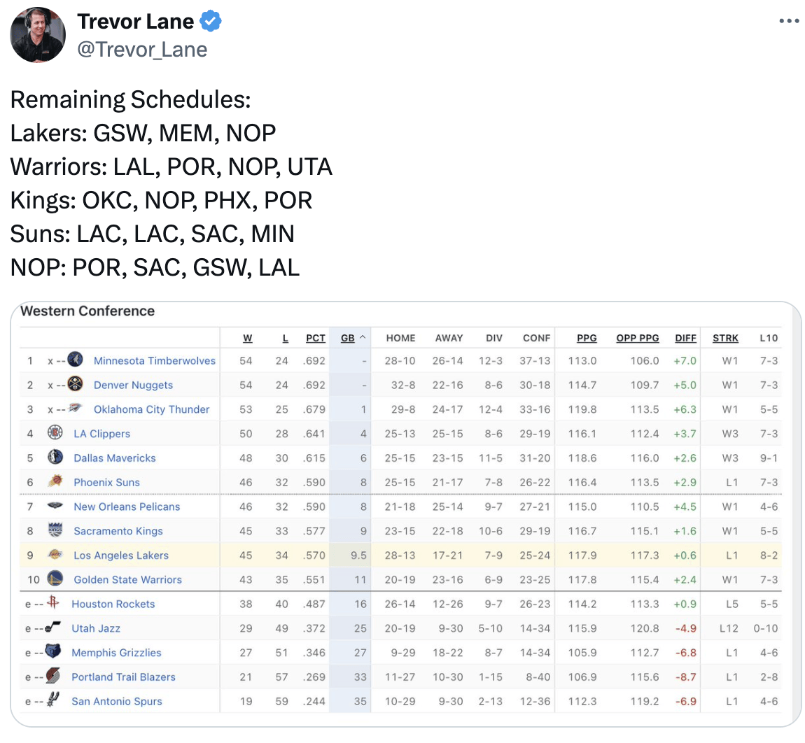 西部競爭激烈,排名的先後或許會決定一支球隊整個賽季的結局。對湖人來說,雖然前六希望渺茫,但或許會有奇蹟上演。