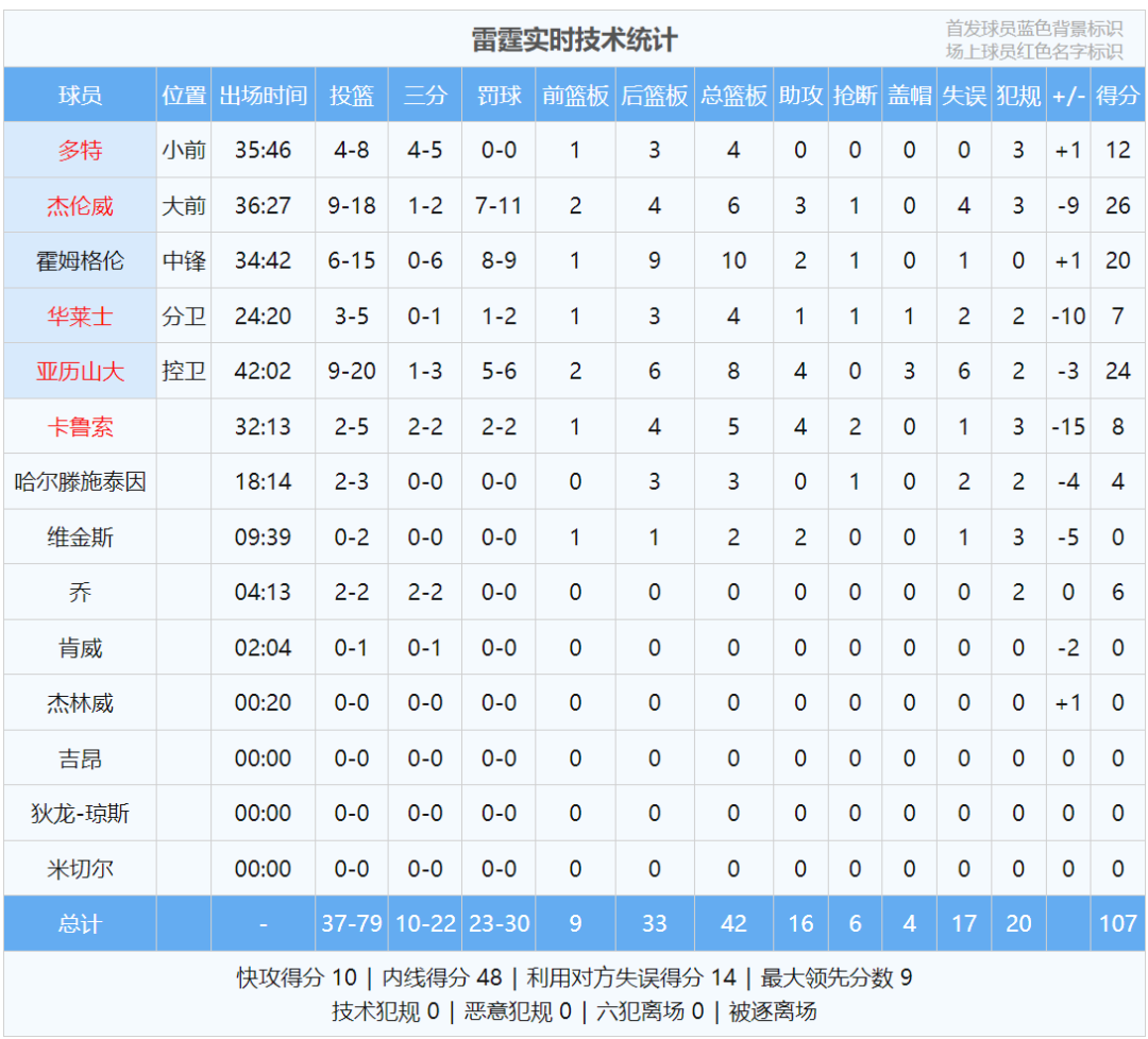 傑威26分6板3助、亞歷山大24分8板4助3帽、霍姆格倫20分10板2助!雷霆17次失誤,送給行屍21分。最後來看看數據: