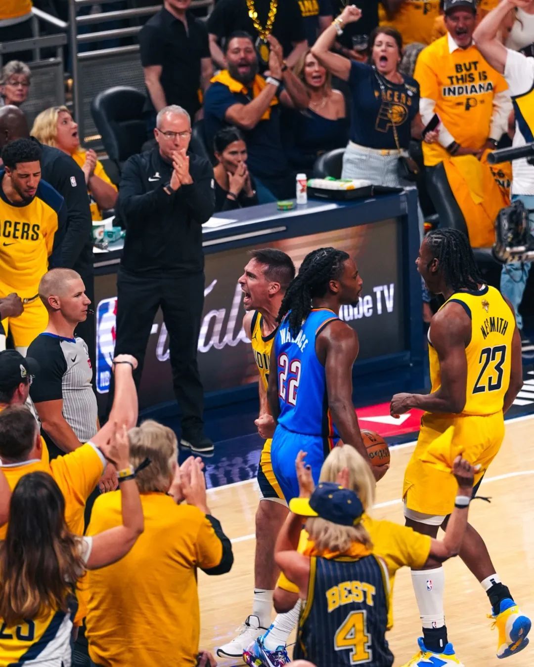 第四節亞歷山大造殺傷,全場球迷狂噓,最後7分鐘兩隊再平手。內姆哈德像膏藥一樣貼著SGA,雷霆棄用雙塔,特納和托平連續在籃下得手,最後3分鐘步行者領先8分。特納一回合兩次封蓋霍姆格倫,1分09秒西卡上籃殺比賽!