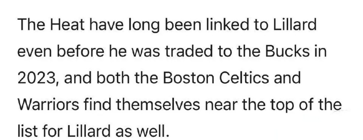 Brett Siegel強調,早在23年利拉德被開拓者隊交易到雄鹿時,邁阿密熱火隊就一直與表哥聯繫緊密,目前凱爾特人和勇士兩支球隊也在爭取利拉德的球隊名單中名列前茅。