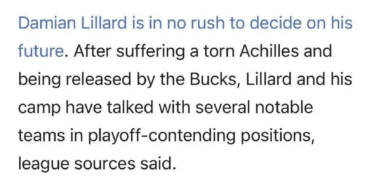 根據名記Brett Siegel報道,NBA75大球星、自由球員利拉德近期已與多支季後賽級別著名球隊接觸,商討加盟事宜。但因專注於跟腱傷病恢復,他不會在近期做出加盟決定。
