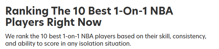 麥迪近日透露,全明星週末有可能舉辦單挑賽,那麼在當今聯盟裡,誰是單挑能力最強的球員呢?美媒結合球員的技巧、穩定性和單挑下的得分能力,評出了目前聯盟單挑最強的10位球員,他們都是讓對手頭疼的“噩夢”,以下是具體排序和解析——